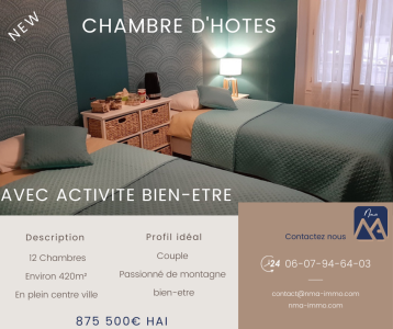 En secteur touristique recherché, Au coeur du plus grand domaine cyclable et moins de 20 minutes des stations de ski Établissement renommé pour les SPORTIFS avec de bons avis sur les sites de réservations en ligne Clientèle nationale et internationale fidélisée de cyclistes et de skieurs Bel Immeuble de caractère de 419 M2 exploité en Gite Chambre D’hôtes BnB En centre-ville, facile d’accès, A proximité de toutes les commodités et des attractions touristiques Comprenant – 12 chambres – 1 appartement privatif pour le propriétaire – Salle de restaurant (licence petite restauration) – Local de stockage, – GARAGE A VELO sécurisé – Salle d’activité – Terrasse avec VUE sur les Montagnes – Grand jardin d’un peu plus de 900 M2 FORT POTENTIEL 3 activités porteuses toute l’année >> En été clientèle VELO … cyclistes et associations >> En Hiver clientèle SKI .. a proximité des grandes stations >> Toute l’année organisation de séminaire et réunion d’association – Vendu Murs et fonds – bon placement pour investisseur – Site internet et réservation en ligne – CA moyen de 100 K€ – Affaire actuellement sous exploité Dossier et visite virtuelle sur demande