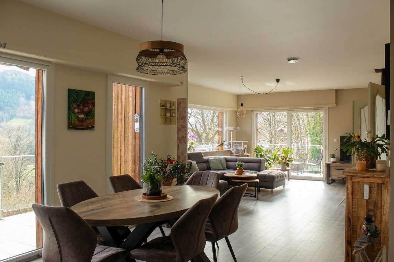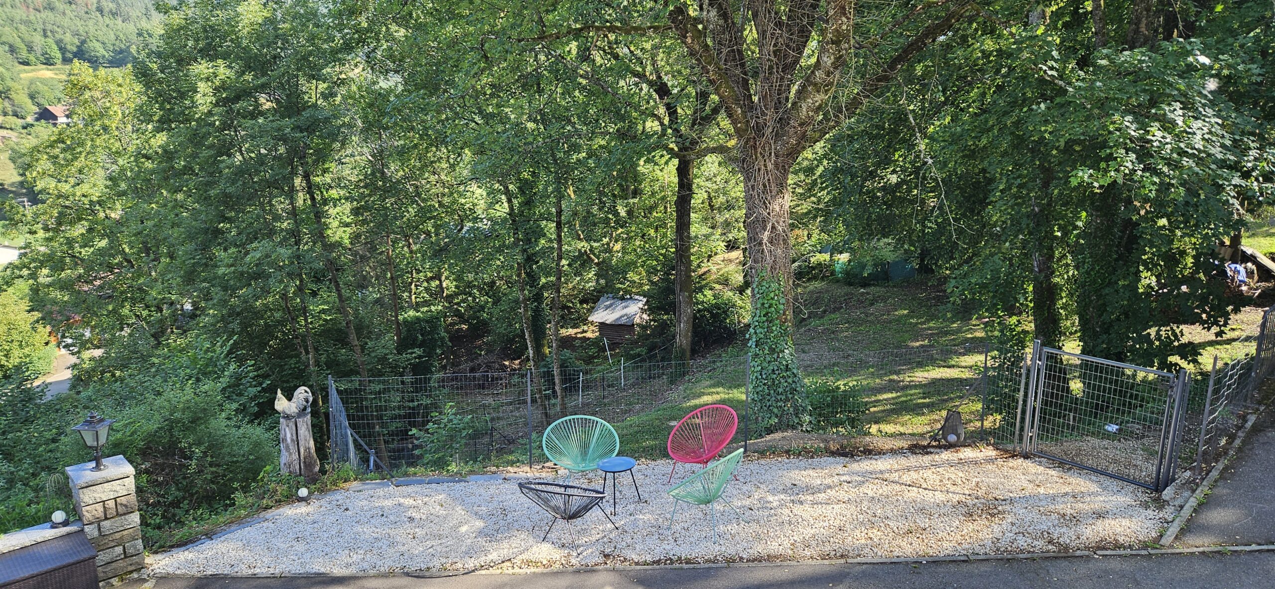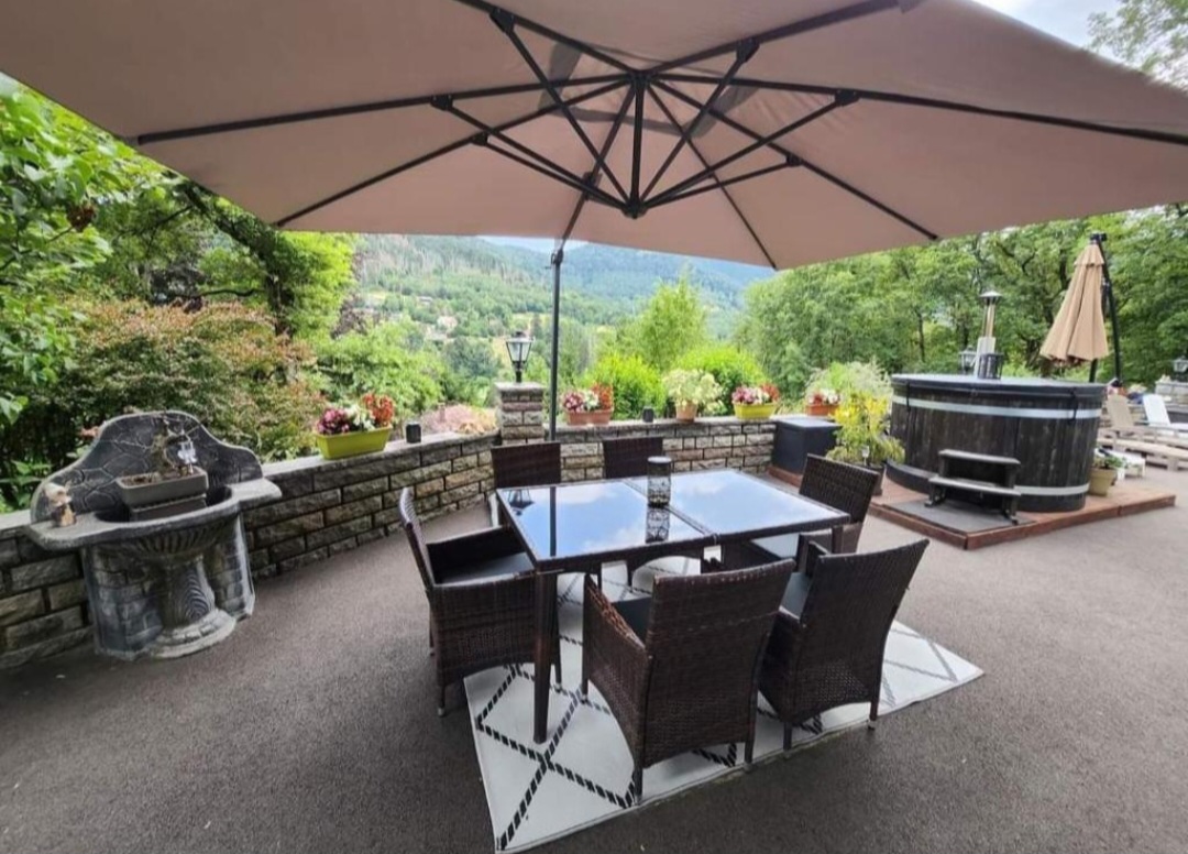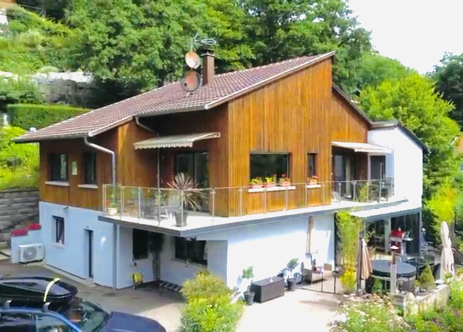 La surface du terrain est de 2300 m². En position dominante, sans vis-à-vis, avec vue sur les montagnes et le Grand Ballon. Un grand espace clôturé pour les animaux, un potager en cascade, le tout paysagé. Un garage pour deux véhicules, un parking pour quatre voitures, tout-à-l’égout. La maison, sur deux étages avec ascenseur, a été entièrement rénovée. Double vitrage, climatisation réversible dans chaque pièce. Ballon d’eau chaude thermodynamique, cheminée à l’étage, combles isolés, toiture traitée et parties inférieures isolées. Elle possède deux grandes terrasses, deux vérandas et un grand balcon en L. Deux cuisines entièrement équipées, deux salons/salles à manger, deux buanderies, quatre chambres avec chacune sa salle d’eau, quatre toilettes séparées et une petite épicerie.