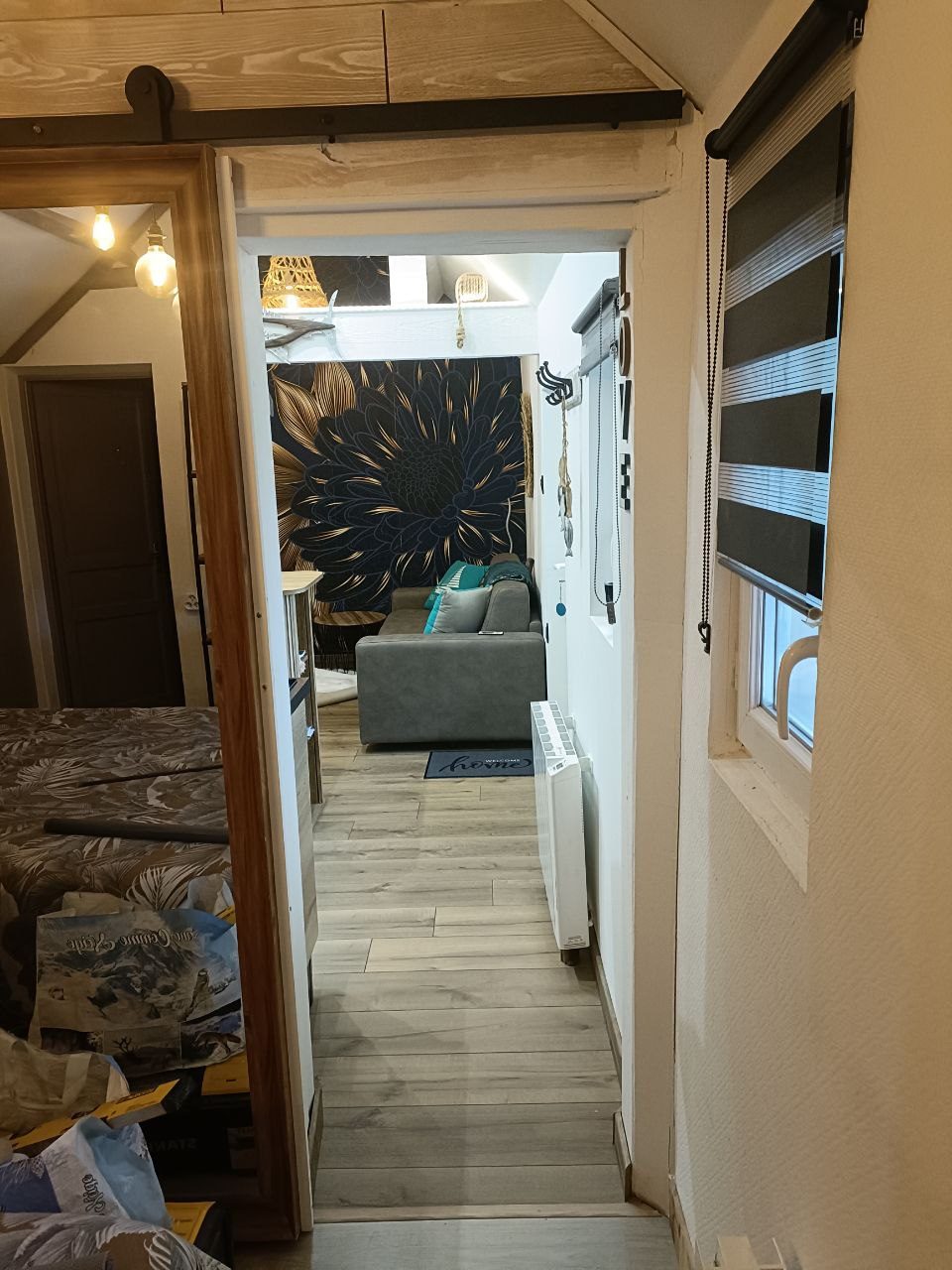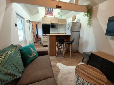 Pièce de vie : 43 m² (salon-séjour, cuisine aménagée/équipée) avec cheminée insert