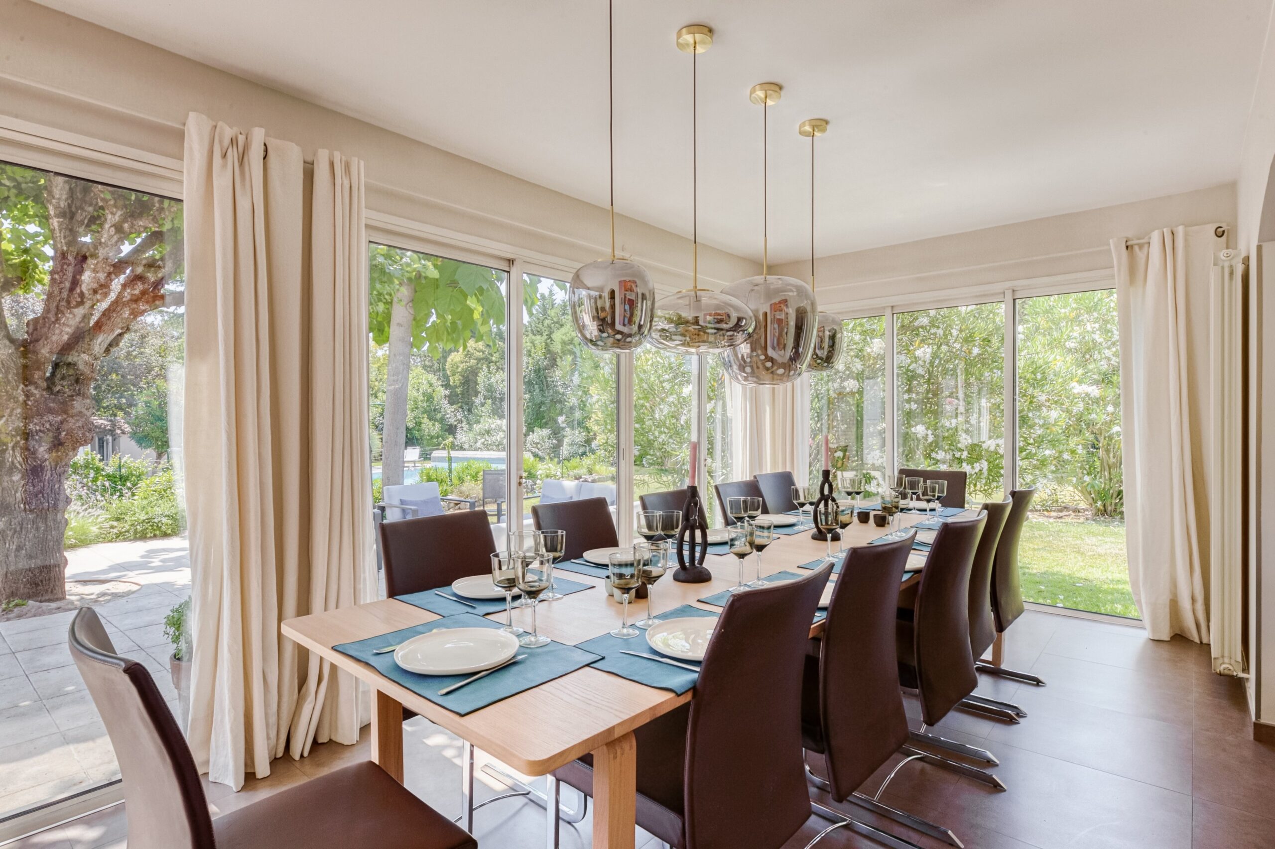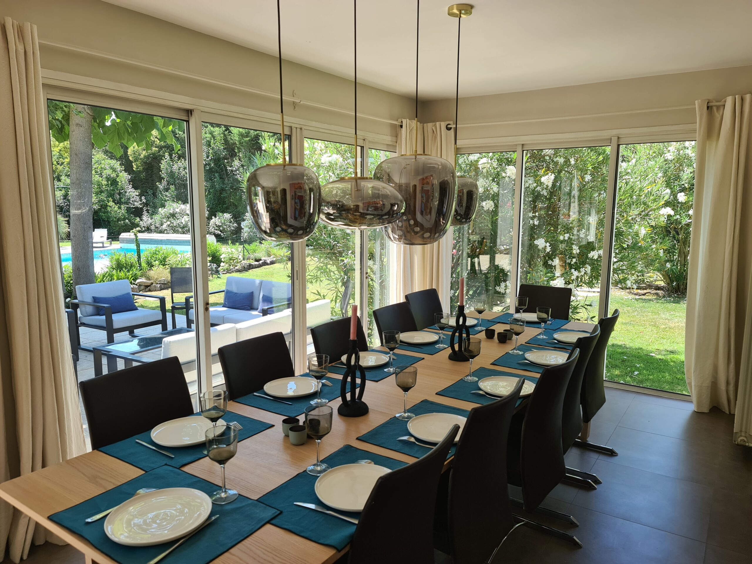 La villa possède 7 chambres avec salle de douche et wc. Salon, Salle à manger cuisine entièrement rénovée avec bar.