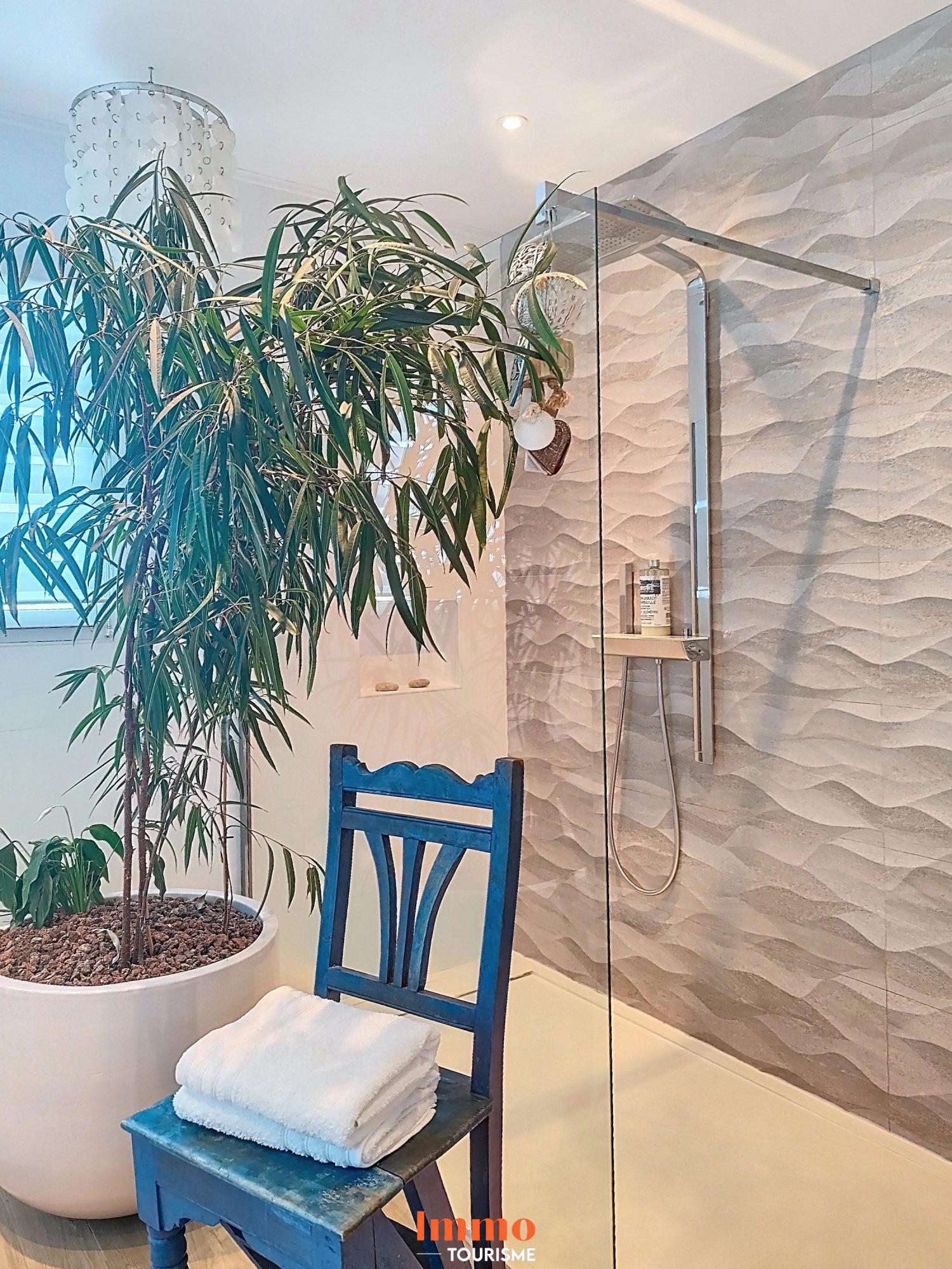 La partie privée comprend une suite parentale de 50 m² avec dressing, salle de bain (baignoire et douche à l’italienne), terrasse et jacuzzi privatif.